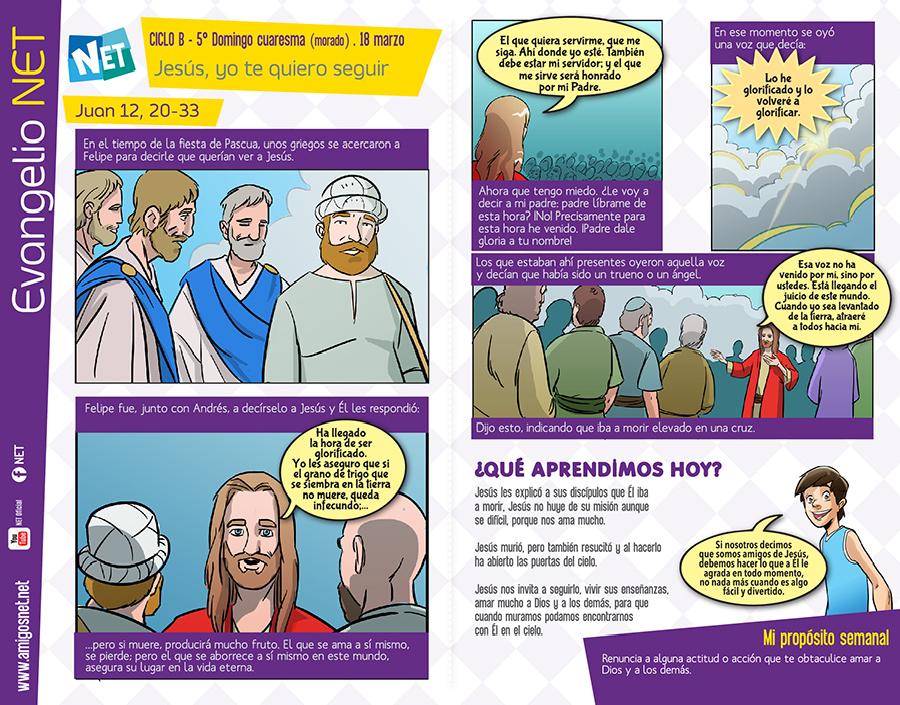 Juan 12, 20, 33 para niños. 16 de Febrero de 2018 Dios nos habla a todos, sin importar nuestra edad o condición social. Conoce lo que él tiene hoy para decirte. Síguenos en nuestra FAN PAGE de FACEBOOK PARROQUIA NUESTRA SEÑORA DE TORCOROMA BOGOTÁ Like 0 Dislike 0 Otros artículosProgramación Semana Santa 202621 de Marzo de 2026Participa en la Semana Mayor, vive cada una de nuestras celebraciones y reflexiona sobre el misterio de la salvación. Ac... “Señor, dame de esa agua para que no vuelva a tener sed”8 de Marzo de 2026Reflexión para el III Domingo de Cuaresma