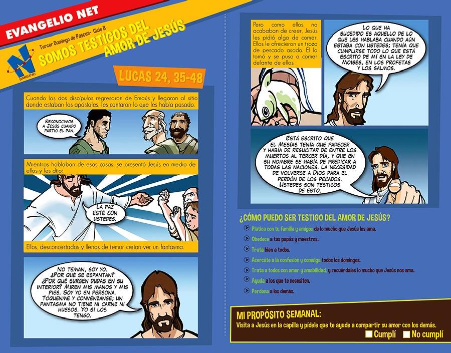 Lucas 24, 35- 48 para niños. 17 de Abril de 2015 Dios nos habla a todos, sin importar nuestra edad o condición social. Conoce lo que él tiene hoy para decirte. Síguenos en Facebook PARROQUIA NUESTRA SEÑORA DE TORCOROMA Like 1 Dislike 0 Otros artículosProgramación Semana Santa 202621 de Marzo de 2026Participa en la Semana Mayor, vive cada una de nuestras celebraciones y reflexiona sobre el misterio de la salvación. Ac... “Señor, dame de esa agua para que no vuelva a tener sed”8 de Marzo de 2026Reflexión para el III Domingo de Cuaresma