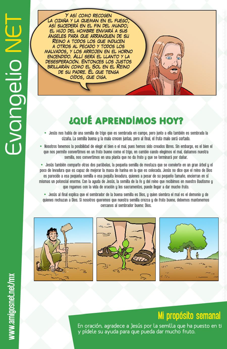 Mateo 13, 24- 43 para niños. El trigo y la cizaña 21 de Julio de 2017 Dios nos habla a todos, sin importar nuestra edad o condición social. Conoce lo que él tiene hoy para decirte. Síguenos en nuestra FAN PAGE de FACEBOOK PARROQUIA NUESTRA SEÑORA DE TORCOROMA BOGOTÁ Like 0 Dislike 0 Otros artículosProgramación Semana Santa 202621 de Marzo de 2026Participa en la Semana Mayor, vive cada una de nuestras celebraciones y reflexiona sobre el misterio de la salvación. Ac... “Señor, dame de esa agua para que no vuelva a tener sed”8 de Marzo de 2026Reflexión para el III Domingo de Cuaresma