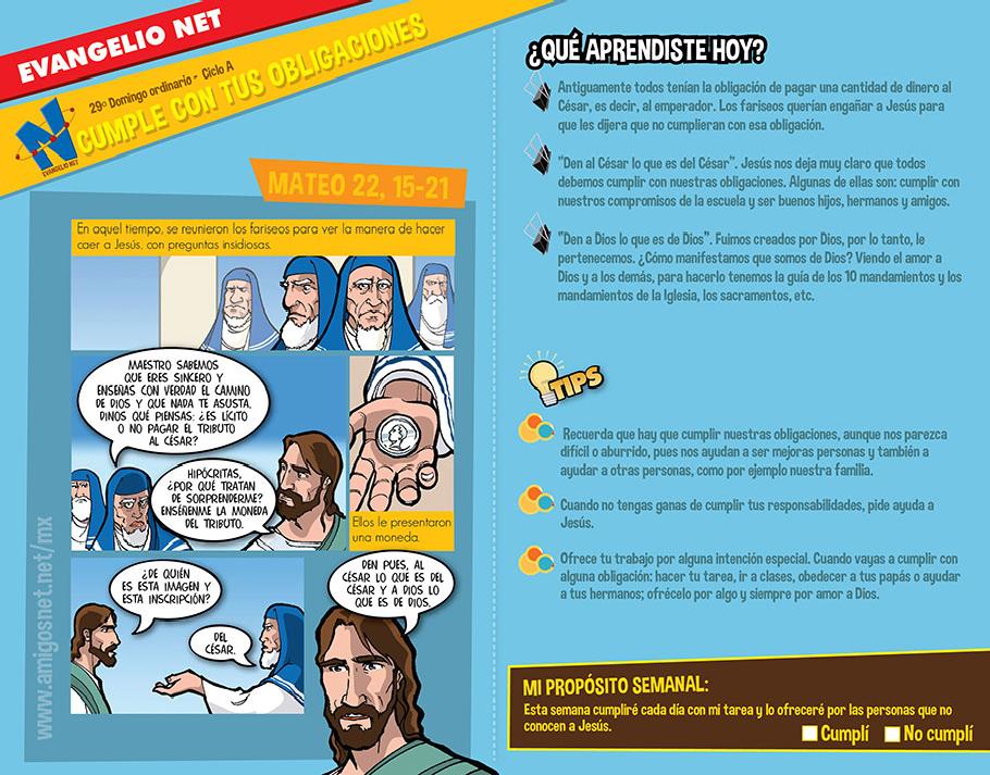 Mateo 22,15-21 para niños- 17 de Octubre de 2014 Dios nos habla a todos, sin importar nuestra edad o condición social. Conoce lo que él tiene hoy para decirte. Like 1 Dislike 0 Otros artículosProgramación Semana Santa 202621 de Marzo de 2026Participa en la Semana Mayor, vive cada una de nuestras celebraciones y reflexiona sobre el misterio de la salvación. Ac... “Señor, dame de esa agua para que no vuelva a tener sed”8 de Marzo de 2026Reflexión para el III Domingo de Cuaresma