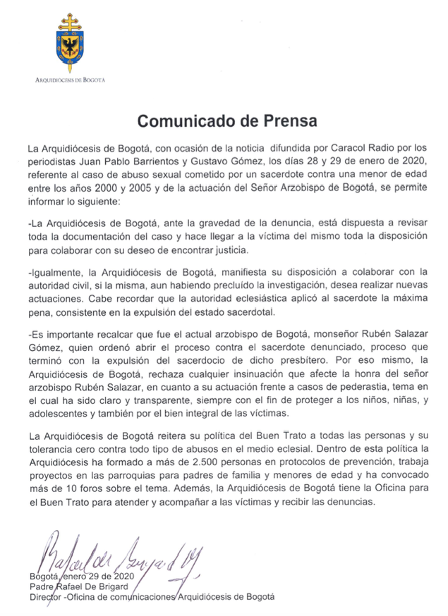 Centro de información Yo quiero Noticias Boletines Eventos Artículos Canonización Mensajes del Señor Cardenal Cartas pastorales Homilías Mensajes La voz del pastor Documentos del Vaticano NoticiasComunicado de prensa29 de Enero de 2020 Like 0 Dislike 0 Noticias relacionadas Video del papa - noviembre de 2025 La Iglesia Samaritana que abraza a Bogotá #Destacado