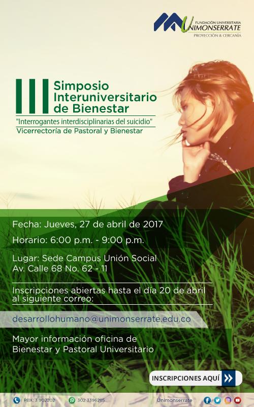 Centro de información Yo quiero Noticias Boletines Eventos Artículos Canonización Mensajes del Señor Cardenal Cartas pastorales Homilías Mensajes La voz del pastor Documentos del Vaticano NoticiasIII Simposio Interuniversitario de Bienestar "Interrogantes interdisciplinarias de suicidio"18 de Abril de 2017Inscripciones abiertas hasta el 20 de abril, mayor información oficina de Bienestar y Pastoral Universitario Like 0 Dislike 0 Noticias relacionadas Archivo del Plan de Predicación - 2024-2025 Tiempo para nutrir, cuidar y testimoniar la fe La Arquidiócesis de Bogotá celebró la ordenación de nuevos sacerdotes y diáconos