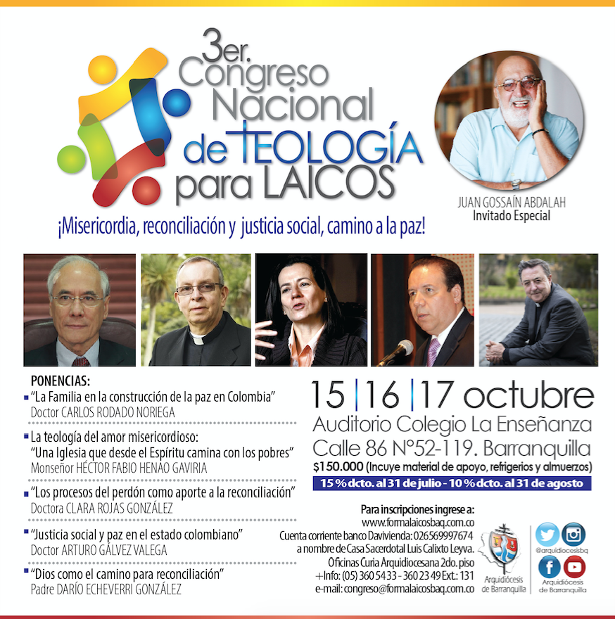 Del 15 al 17 de octubre de 2016 se realizará en el Colegio La Enseñanza de Barranquilla el Tercer Congreso Nacional de Teología para Laicos con la participación de ponentes del orden nacional que provienen de la Iglesia, la política, la academia, la diplomacia y los medios de comunicación.