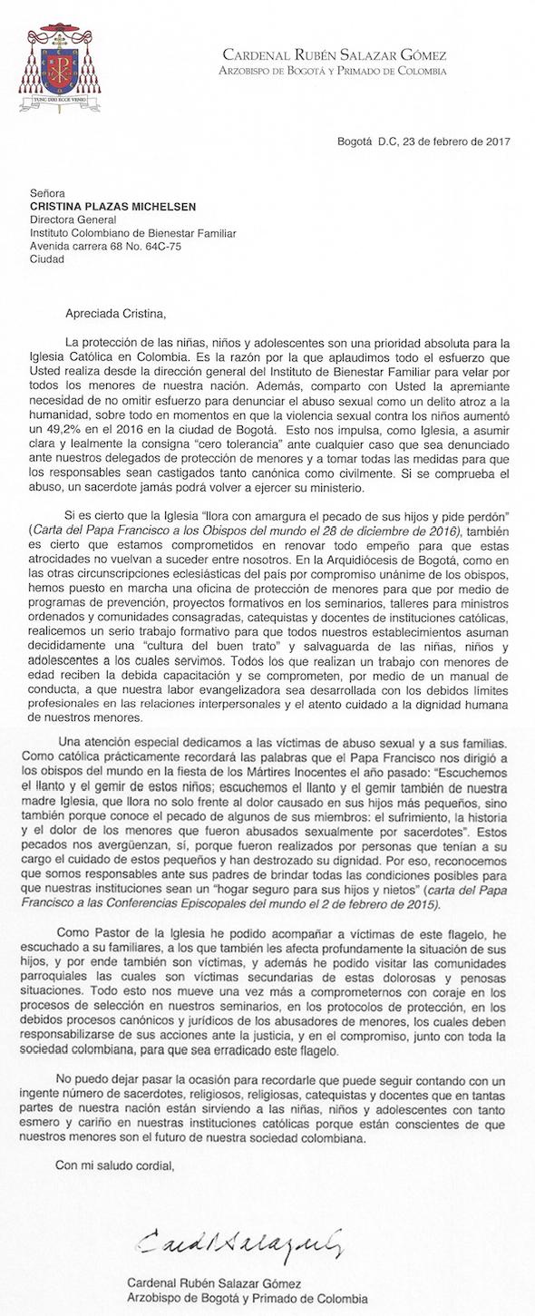 Respuesta del Cardenal Arzobispo de Bogotá a la Directora del ICBF
