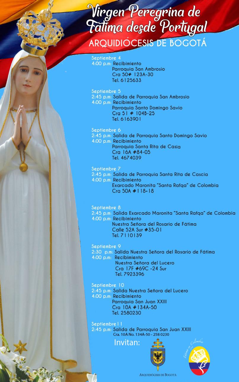 Centro de información Yo quiero Noticias Boletines Eventos Artículos Canonización Mensajes del Señor Cardenal Cartas pastorales Homilías Mensajes La voz del pastor Documentos del Vaticano NoticiasVirgen peregrina de Fátima visita Arquidiócesis de Bogotá5 de Septiembre de 2018La imagen peregrina de Nuestra Señora del Rosario de Fátima que llegó a Colombia desde el pasado 27 de abril y que se encuentra visitando diferentes diócesis del pais,… Like 0 Dislike 0 Noticias relacionadas Video del papa - noviembre de 2025 La Iglesia Samaritana que abraza a Bogotá #Destacado